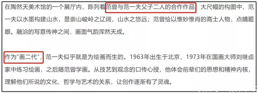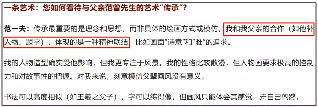 范一夫虽然并非亲生,但没少得到范曾的帮助,从小就跟着范曾学画,在采访中范一夫也提到和范曾之间有一种“精神联结”的传承。