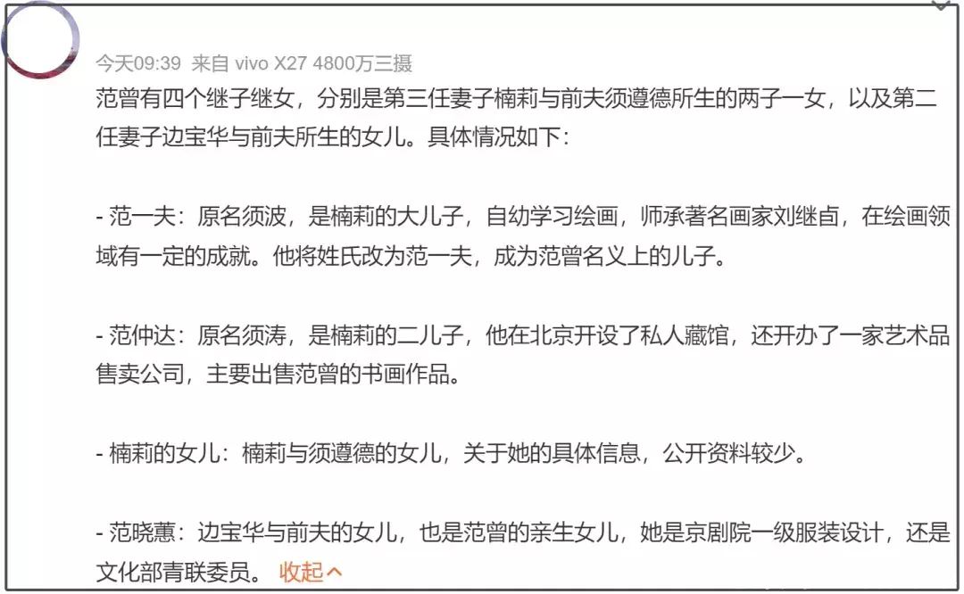 说起范一夫,虽然他在采访中多次以“范曾儿子”的身份出现,但据爆料范一夫原名须波,是范曾第三任妻子楠莉和前夫须遵德的大儿子,后来跟着范曾改姓。