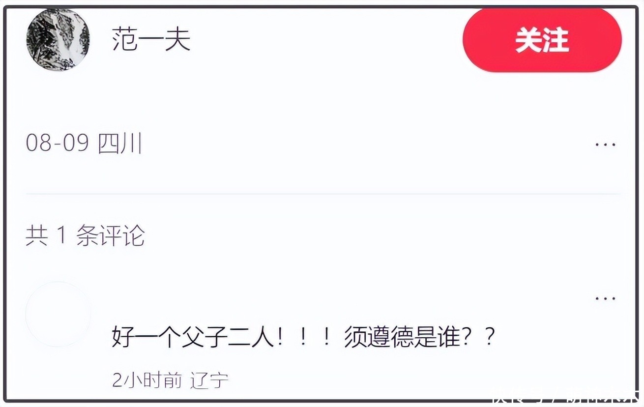 还有网友跑到范一夫分享采访的评论区留言称,“好一个父子二人,须遵德是谁”?疑似暗指范一夫在采访中含糊其辞,不提生父,一副以范曾亲生儿子、传人身份自居的样子。