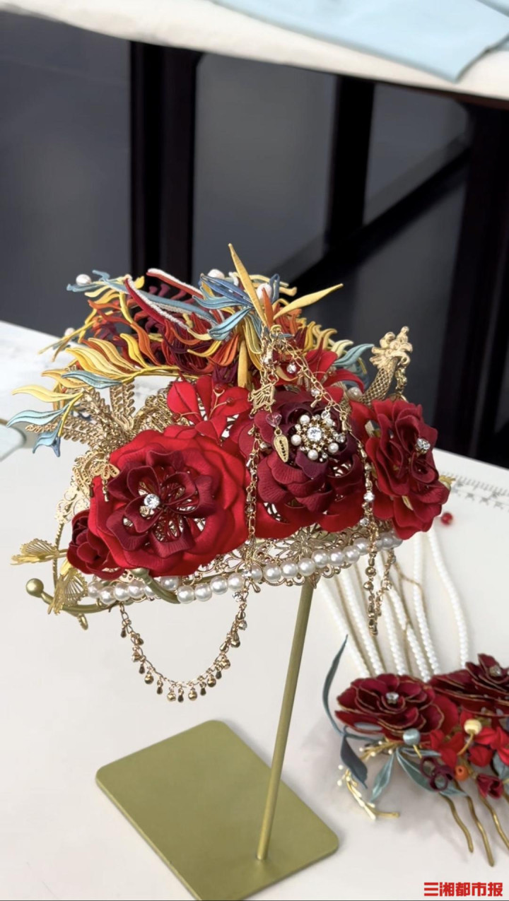 凤冠的灵感,源自中式婚礼中寓意深远的凤凰图腾。“我想用现代人能共鸣的视觉语言,重新诠释这份沉淀千年的传统之美。”夏富磊向记者讲述了创作初衷。